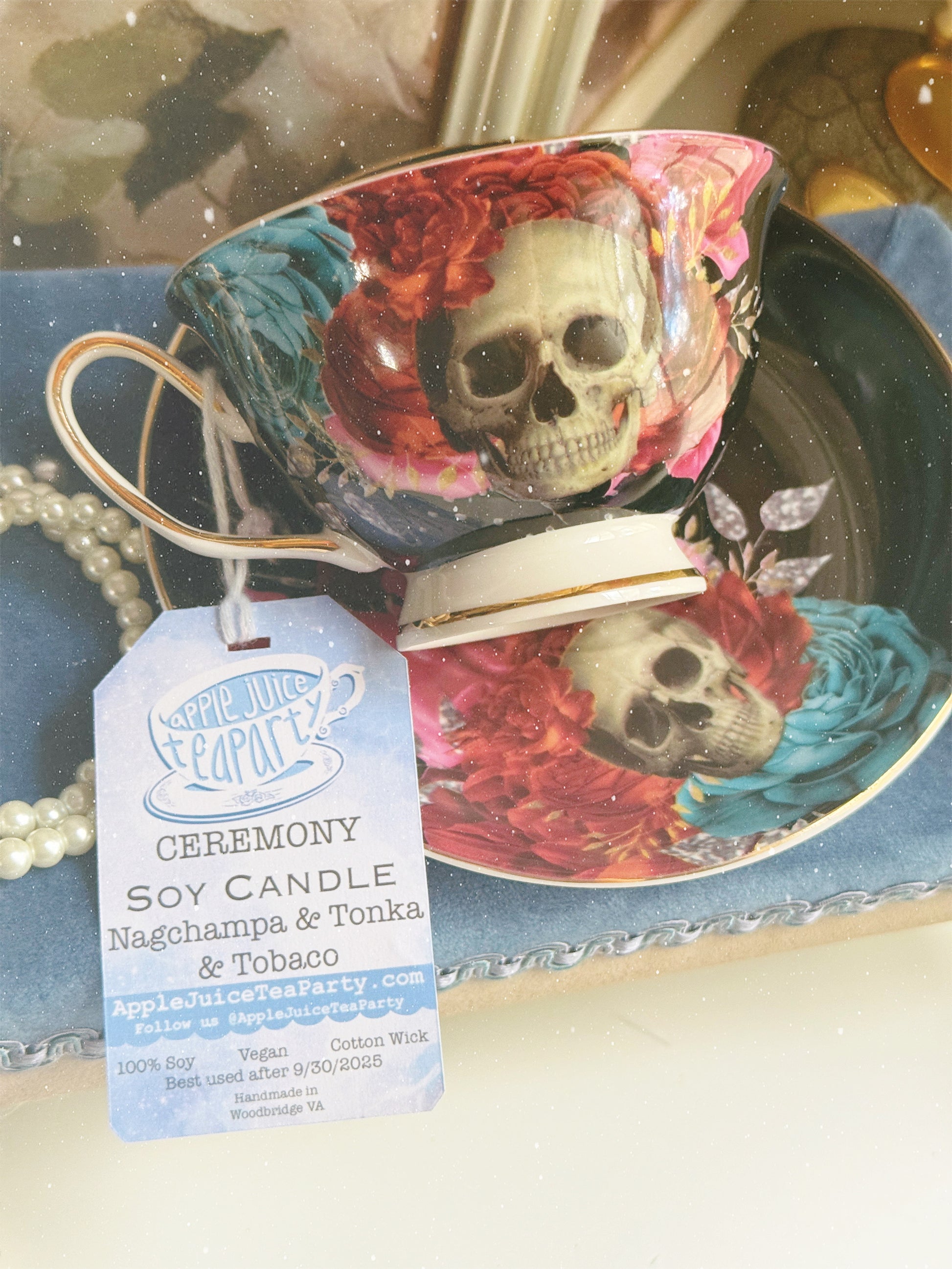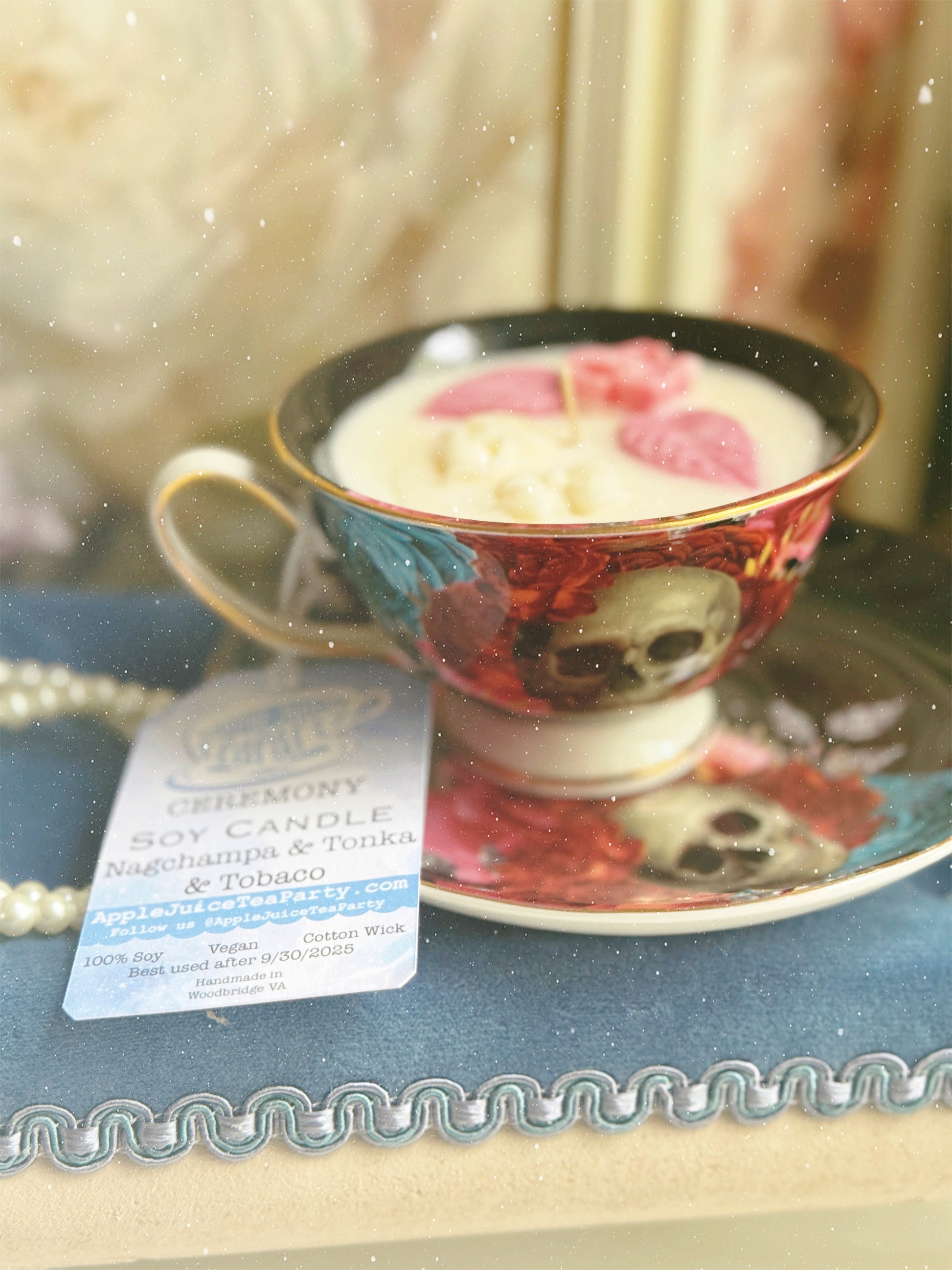 100% soy wax, cotton braided candlewick, vintage teacup, fragrance.