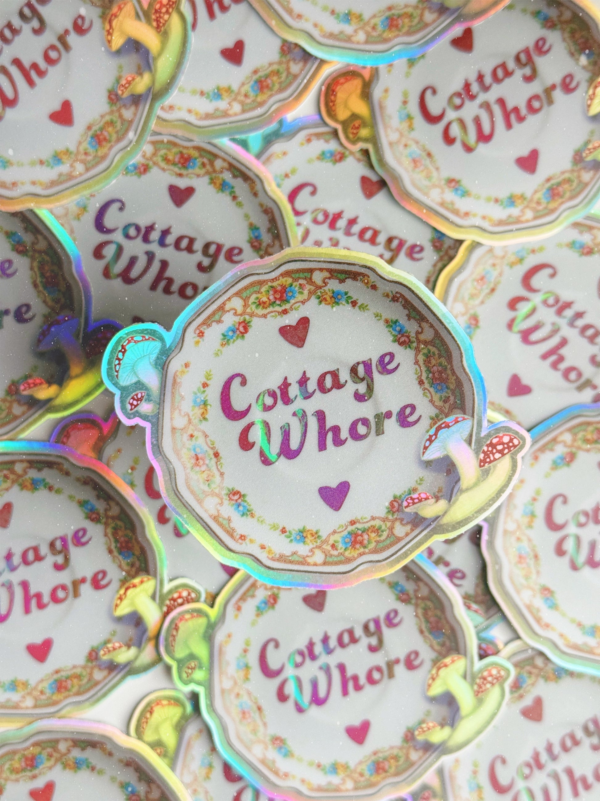 3 inch vinyl Cottage Whore sticker has a mage finish, Holographic shine, and is safe to add to a water bottle (waterproof but not recommended for the dishwasher).
