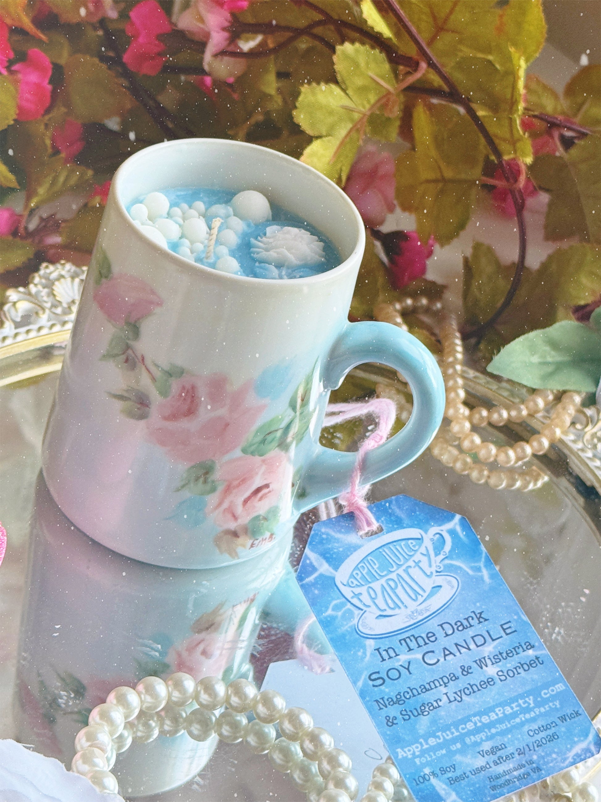 100% soy wax, cotton braided candlewick, vintage teacup, fragrance.