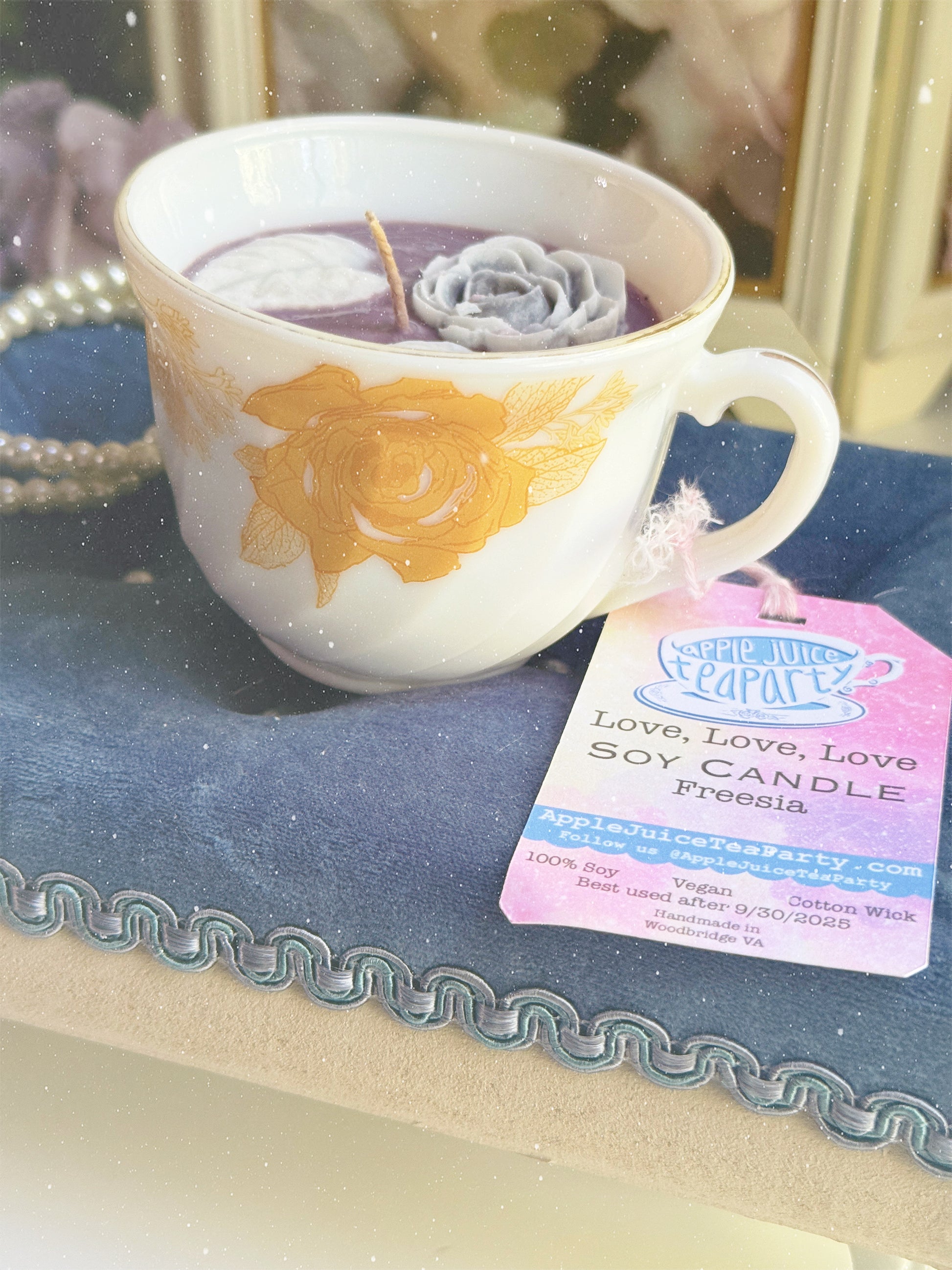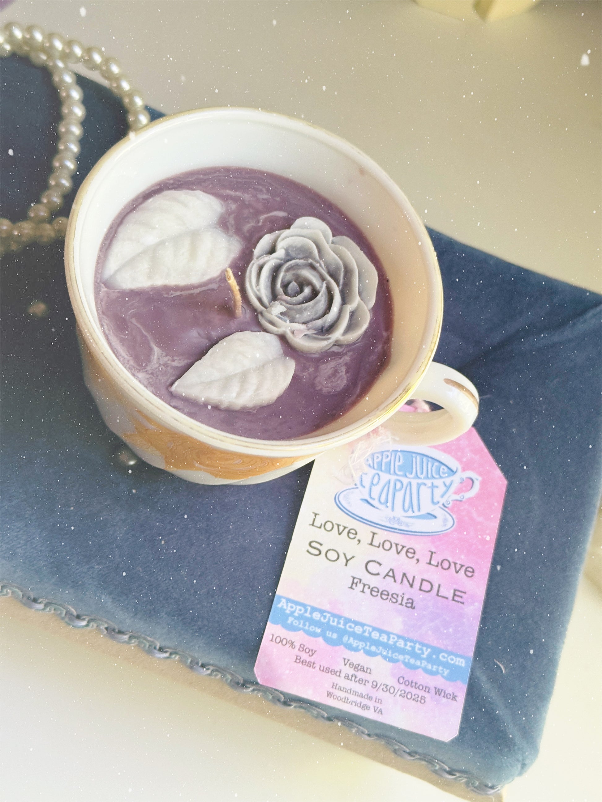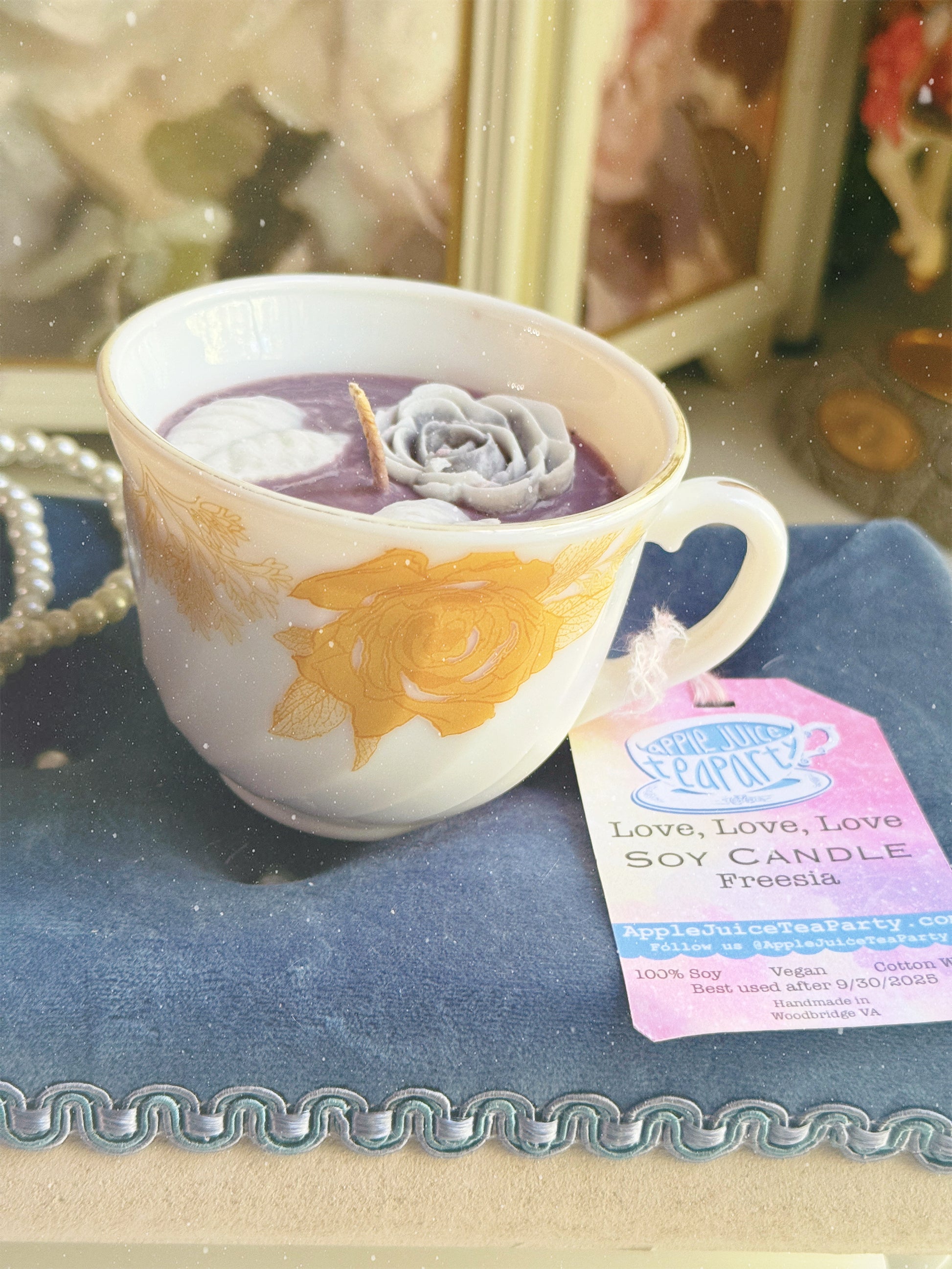 Done with your candle? Place the cup in a tub of hot water (NOT boiling, don’t hurt yourself!) for a few hours, the excess wax will melt out and float to the top of the water. Wash your teacup and it will be usable again!