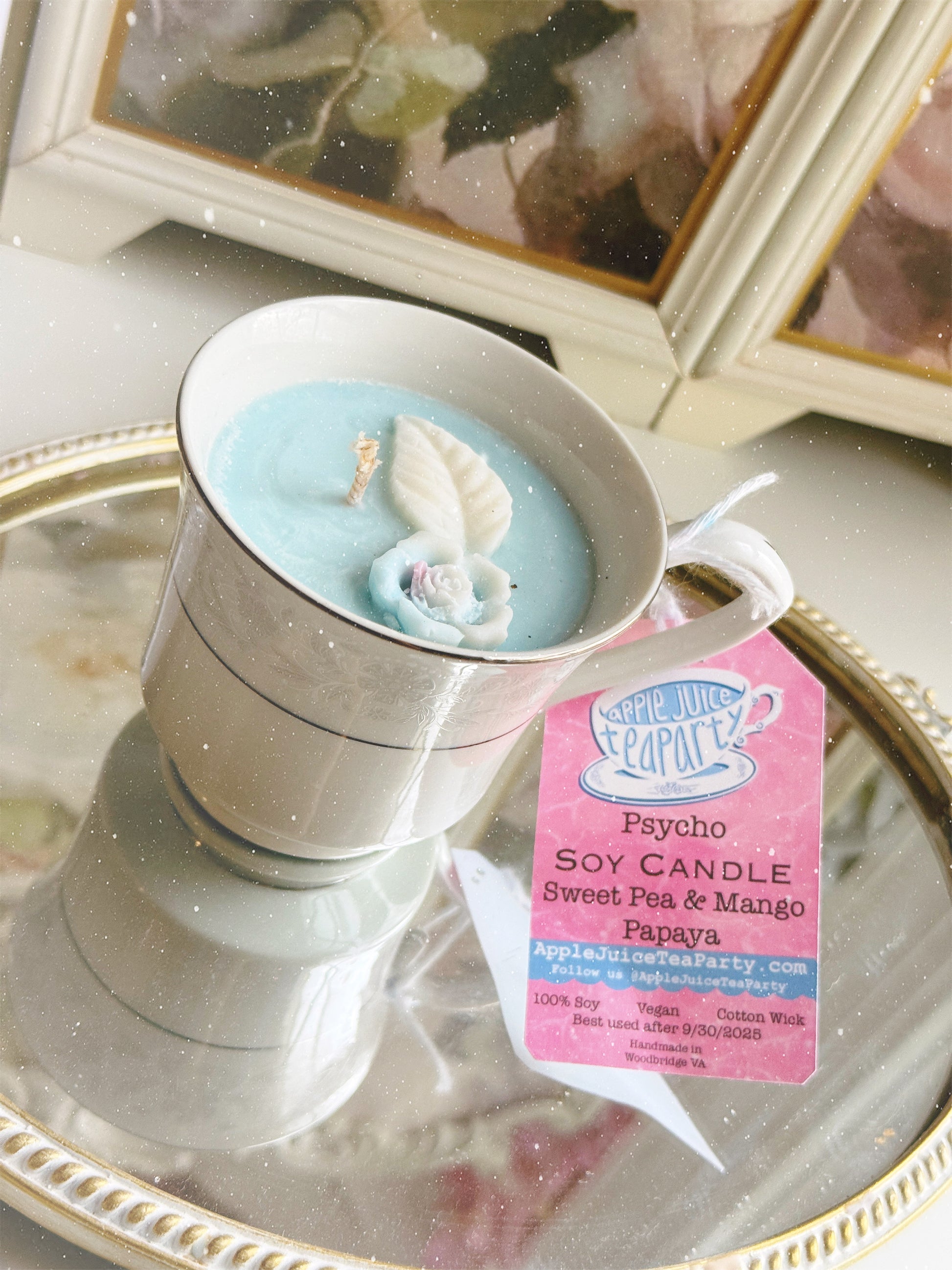 Floral Teacup Candle. 100% soy wax, cotton braided candlewick, vintage teacup, fragrance.