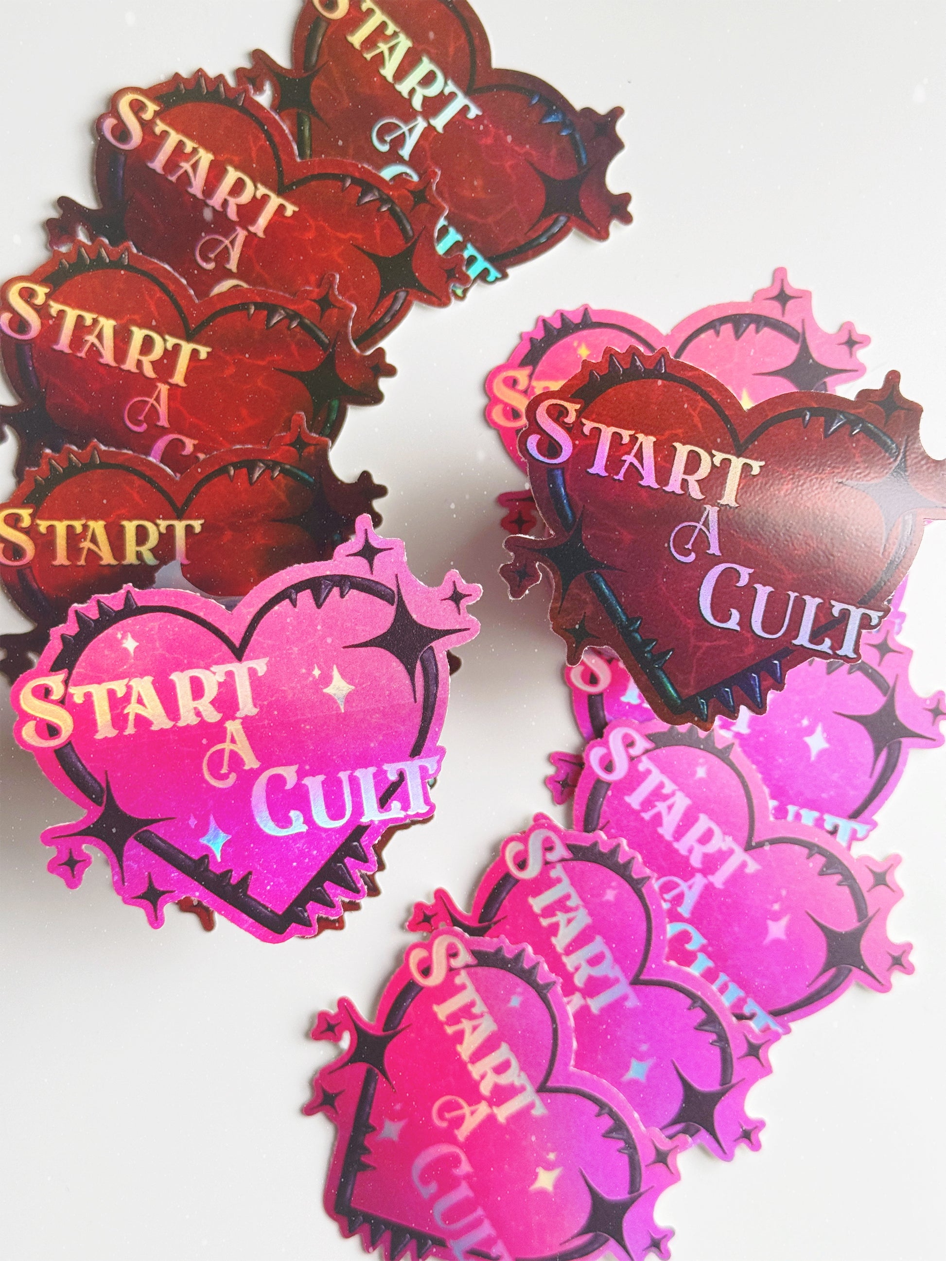 3-inch-long vinyl Start a Cult sticker has a Matte finish, Holographic shine, and is safe to add to a water bottle (waterproof but not recommended for the dishwasher).