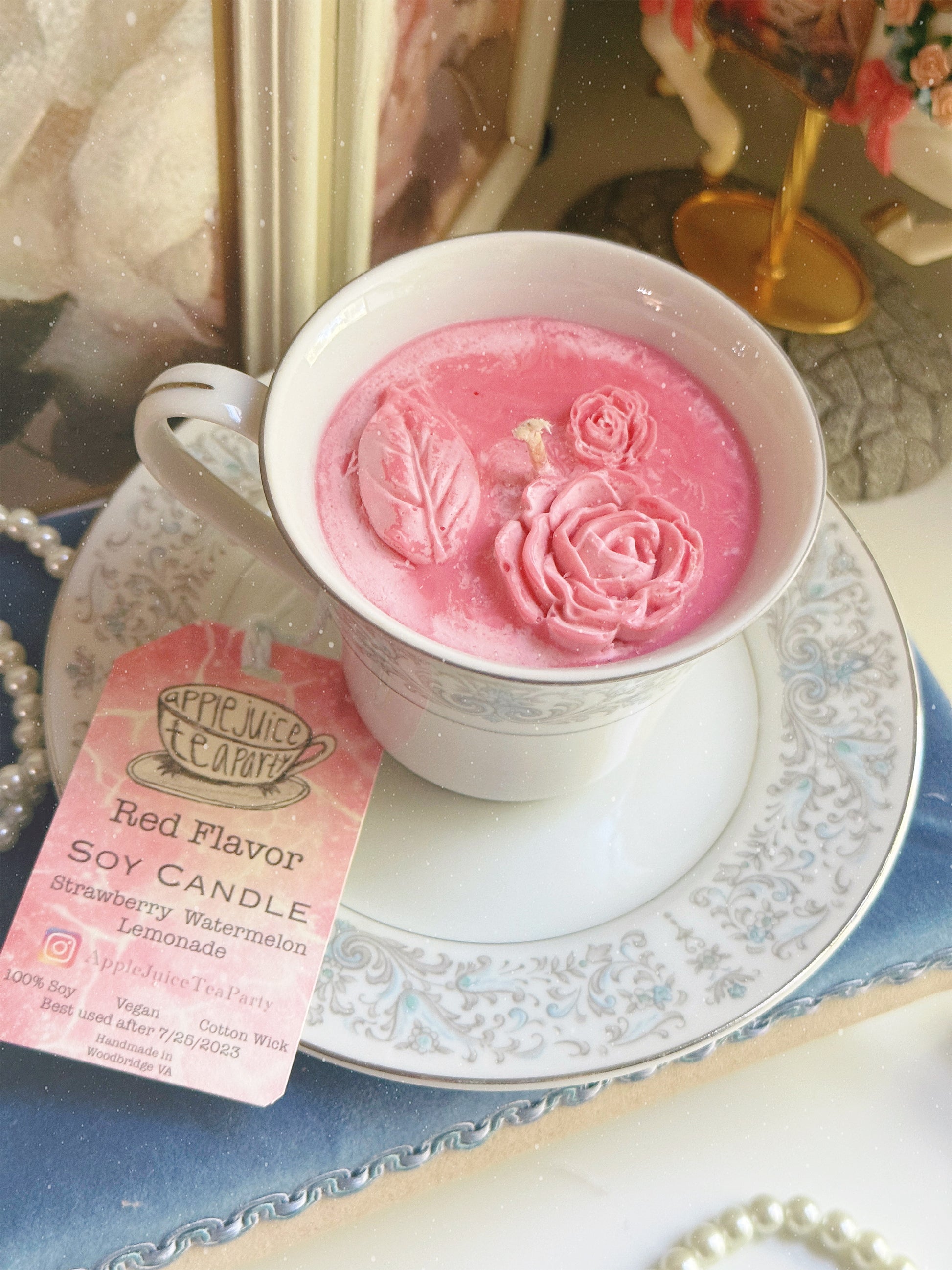 100% soy wax, cotton braided candlewick, vintage teacup, fragrance.